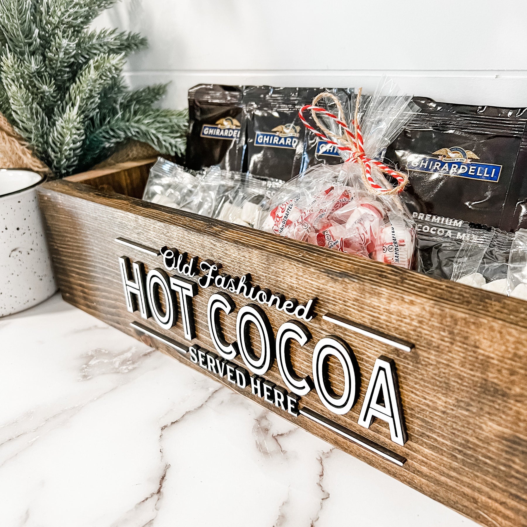 JUST THE BOX- Wood hot cocoa box stained dark walnut, raised 3D wood lettering painted white, opening measures approximately 13.5"L x 3.5"W x 3"H. (ADD YOUR OWN SUPPLIES TO CREATE THE PERFECT HOT COCOA BAR)