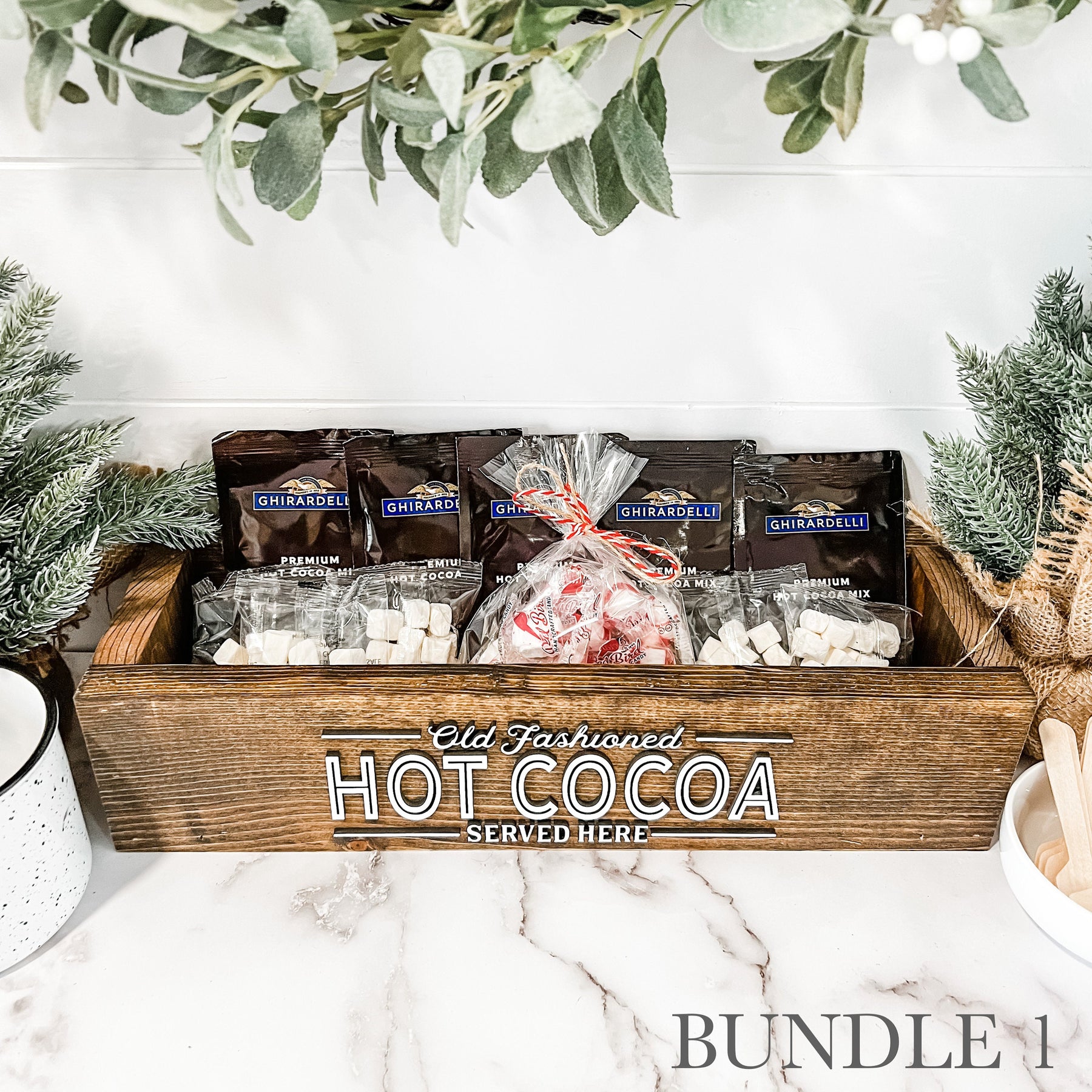 BUNDLE 1- Includes Wood Hot Cocoa Box + 5 Ghirardelli Hot Cocoa Packs + 5 Individually Packaged Marshmallows + 15 Soft Peppermint Candies (PERFECT FOR GIFT GIVING)